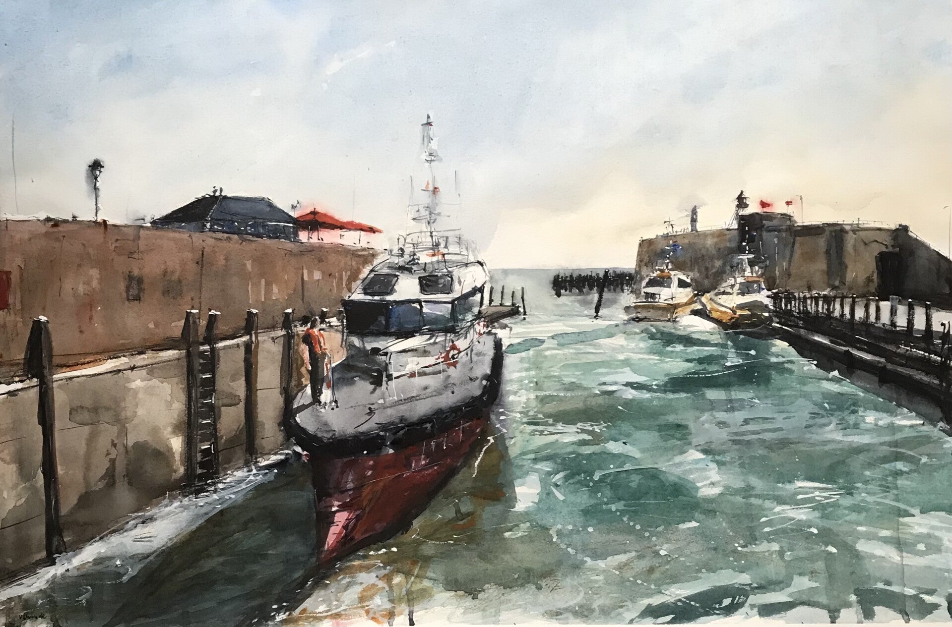 Groot formaat aquarel Koningshaven Vlissingen met Loodsen