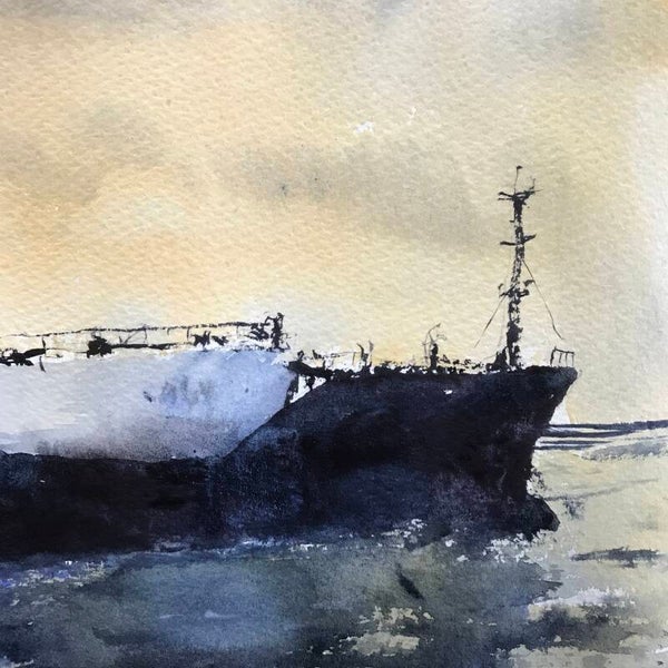 Aquarel Vlissingen, passerende schepen Westerschelde